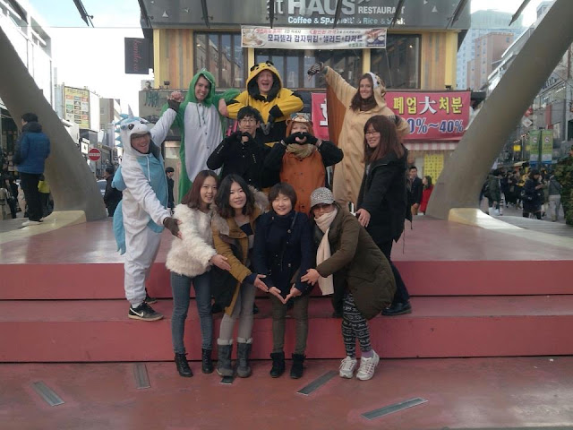 I have seen millions of people consumed by their smart phones, countless couples wearing matching outfits, people dressed in animal costumes (myself included), elderly ladies who are permanently bent forward, men holding hands, people making the peace sign for photos, people forming hearts with their hands for photos, taxis everywhere, coffee shops on every block, Hyundai and Kia, cell phone shops on every block, young ladies dancing outside of cell phone shops, men stumbling drunkenly down the road, dragonflies, praying mantises, magpies, crowded fish tanks with the ugliest fish I've ever seen, octopus tanks, and small dogs with dyed fur.